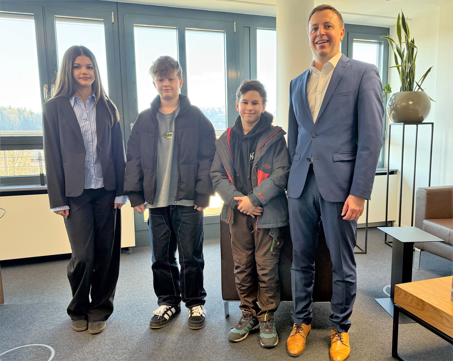 Oberbürgermeister Dr. Christian Hümmer (rechts) begrüßt die Jugendlichen, die bei der Stadt den Girls‘ und Boys‘ Day verbringen (von links): Aliyah Bauer, Leonhard Feichtenschlager und Nicolas Krüger.