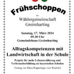 Die Wählergemeinschaft Greimharting veranstaltet am Sonntag, 17. März ab 9.30 Uhr einen Frühschoppen mit dem Thema „Alltagskompetenzen mit Landwirtschaft in der Schule – Projekt für mehr Lebensweltbezug und Verbraucherbildung an bayerischen Schulen.“ – Maria Riepertinger stellt beim Frühschoppen der Wählergemeinschaft Greimharting am Sonntag, 17. März 2024 ab 9.30 Uhr im Gemeindehaus in Greimharting das Projekt „Alltagskompetenzen mit Landwirtschaft in der Schule“ und eines ihrer Programme in diesem Projekt im Rahmen eines kurzweiligen Vortrages mit Diskussionsmöglichkeit vor.