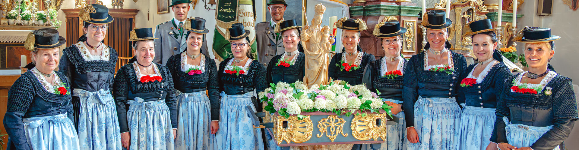 Frauen des Trachtenvereins Hochries-Samerberg in festlicher Tracht beim heutigen Patrozinium in der Pfarrkirche Mariä Himmelfahrt in Törwang – feierlich versammelt um die mit Blumen geschmückte Statue der Gottesmutter.