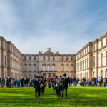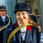 Als die klassischen Hornsignale der Chiemgauer Jagdhornbläser “Bien Aller de Baviere” und ihrer Jungbläsern, den Bayerischen Jungwölfen, „Les Louvarts de Baviere“ riefen, formieren sich alle Reiter um zum großen Stelldichein mit der Hundemeute vor der Kapelle des Alten Schlosses.