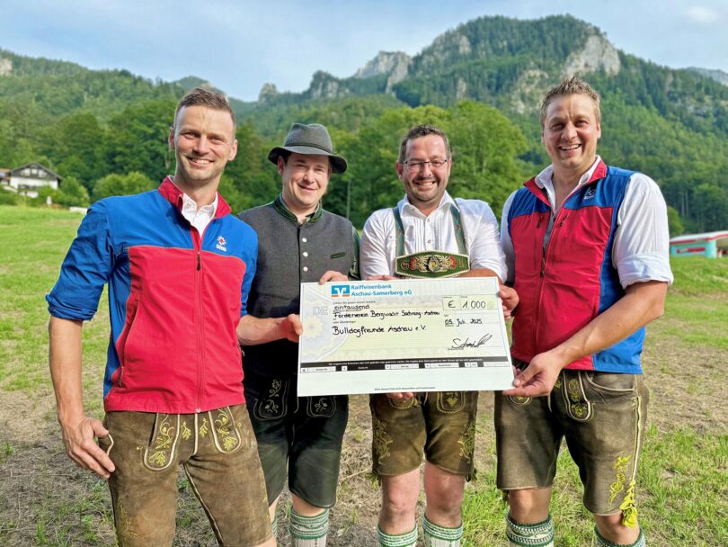 Doch neben dem nostalgischen Motorenbrummen stand auch der gute Zweck im Vordergrund: Aus dem Erlös der Veranstaltung konnte nun eine Spende in Höhe von 1.000 Euro an die Bergwacht Sachrang-Aschau überreicht werden. Bereitschaftsleiter Thomas Riepertinger (links) von der Bergwacht Sachrang-Aschau freut sich über die großzügige Spende, die ihm von Alois Schmid junior (Zweiter von links) und Sebastian Aringer (Dritter von links) von den Bulldogfreunden Aschau überreicht wurde. Auch Andreas Angermaier (rechts), zweiter Vorsitzender des Fördervereins Bergwacht Sachrang-Aschau e.V., zeigte sich dankbar über die willkommene Finanzspritze – eine Unterstützung, die bei der ehrenamtlichen Arbeit sehr geschätzt wird. Mit dieser „maschinenschweren“ Geste unterstützen die Bulldog-Freunde die wertvolle, ehrenamtliche Arbeit der Bergwacht in der Region – ein starkes Zeichen aus der Mitte der Gemeinschaft.