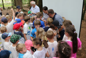 Bei der Verteilung der Geschenke gab es einen Ansturm auf Nationalparkleiterin Ursula Schuster, Umweltbildungsreferent Lukas Laux (l.) und stellvertretenden Bürgermeister Günther Nama (r.)