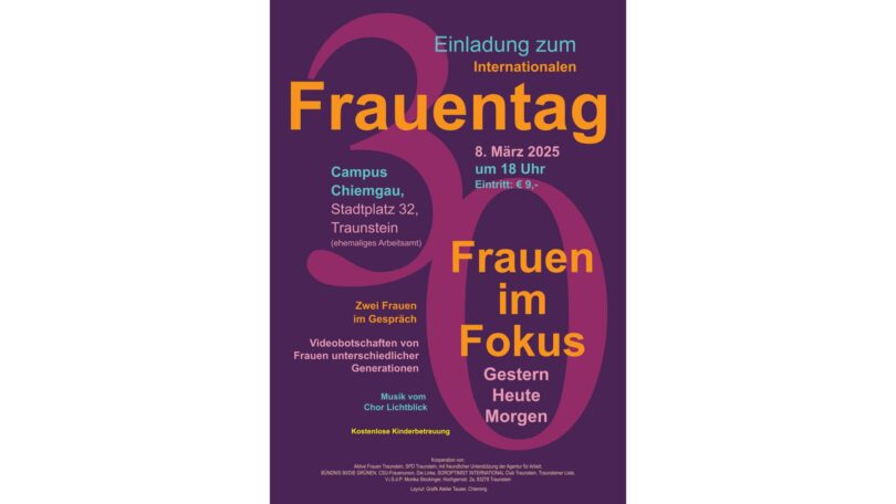 Zur Feier des Jubiläums heißt es „Frauen im Fokus“ mit Videobotschaften von Frauen unterschiedlicher Generationen zu „Gestern, Heute, Morgen“ – wie sich die Rolle der Frau verändert hat. Die interviewten Frauen kommen alle aus der Region. Für die musikalische Untermalung sorgt der Chor Lichtblick, der Frauenchor aus Vachendorf. Es gibt erstmals eine kostenlose Betreuung für Kinder. Veranstalter sind Aktive Frauen Traunstein, SPD Traunstein, Bündnis 90/Die Grünen, CSU-Frauenunion, Die Linke, Soroptimist International Club Traunstein, Traunsteiner Liste, mit Unterstützung der Agentur für Arbeit. Im Anschluss kann diskutiert werden und es gibt einen Imbiss mit Getränken, organisiert von den veranstaltenden Vereinen.
