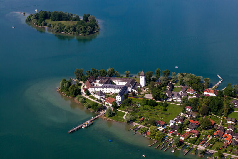 Die Benediktinerinnenabtei Frauenwörth auf der Fraueninsel im Chiemsee – Luftaufnahme aus westlicher Perspektive. Seit dem 8. Jahrhundert ist das Kloster geistliches Zentrum auf der Insel. Die Selige Irmengard, Tochter Ludwigs des Deutschen, wirkte hier als Äbtissin und wird bis heute als Patronin des Chiemgaus verehrt.