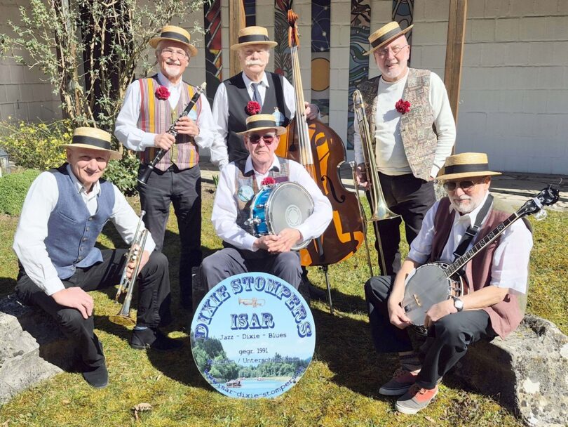 In der traditionellen Dixie-Besetzung mit Klarinette, Banjo, Trompete, Posaune, Kontrabass/Sousaphon und Schlagzeug spielt die Jazzband Isar -Dixie-Stompers am Sonntag, 24. August von 10 Uhr bis 12 Uhr auf der Brunnenhof-Bühne im Kurhaus Bad Aibling auf. Dabei hört man New Orleans Jazz (1900 – 1930) bis hin zu Dixieland-Stil (1950er – 1970er). Ihre Vorbilder sind unter anderem Monty Sunshine, Chris Barber Band, Max Collie, Old Merrytale Jazzband, Hot Dogs, …