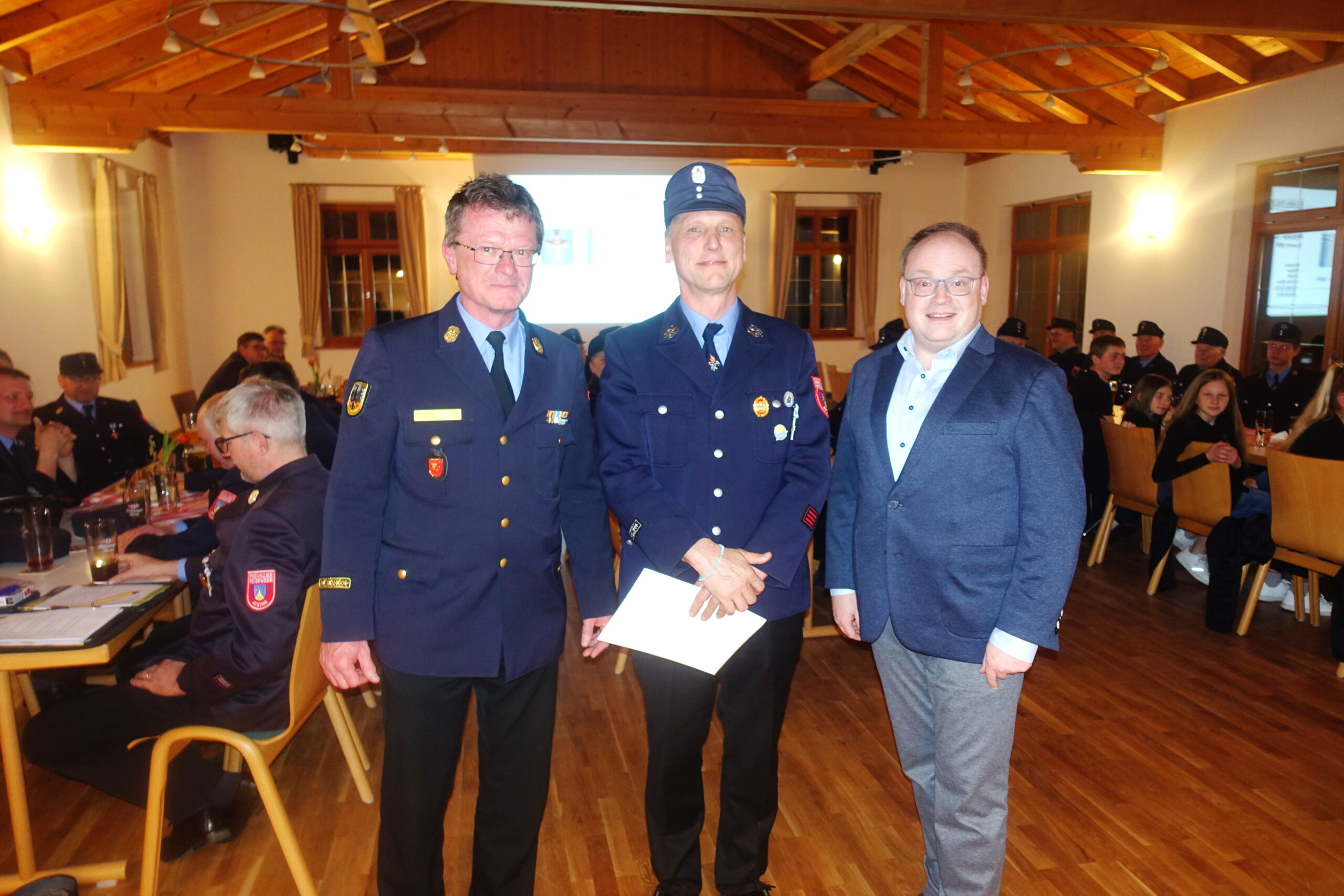 Ehrung für Schorsch Müller (Mi.) durch Kreisbrandmeister Stefan Pfliegel (li.) und Bürgermeister Andreas Friedrich.