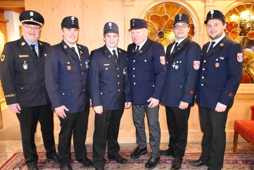 Text und Foto: Sybilla Wunderlich – von links: Kreisbrandinspektor Rupert Kink, Kommandant Johann Troibner, Markus Schatz, Hubert König, David Hofmeister, 1. Vorstand Simon Aigner