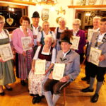 2. Ehrungen für 25 bis 70 Jahre Mitgliedschaft vorne sitzende Gerti Wächter und Lenz Fischer (70 Jahre) – dahinter von links:  Anna Berger (50), Anni Osterhammer (40), Sepp Schlemer (25), Hamberger Elisabeth (40), Regina Schlemer (25), Elisabeth Angermann (50), Bepp Grill (40) und Georg Schuster (60).
