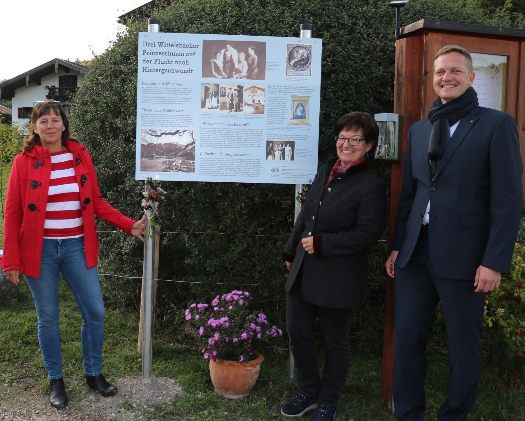 Die Vorsitzende des Heimat- und Geschichtsvereins Dr. Natascha Mehler, die Historikerin Martina Stoib und Aschaus Bürgermeister Simon Frank vor der neuen Info-Tafel zum Gedenken an den Aufenthalt der drei bayerischen Königstöchter im Jahre 1918 in Hintergschwendt