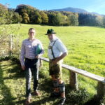 Foto: Hötzelsperger – Oberbayerns Volksmusikpfleger Leonhard Meixner (li.) bei seinem Besuch auf dem Samerberg bei Ehrenvorstand Hans Sattlberger vom Trachtenverein Grainbach mit der Hochries und deren Drei-Seiten-Almen im Hintergrund.