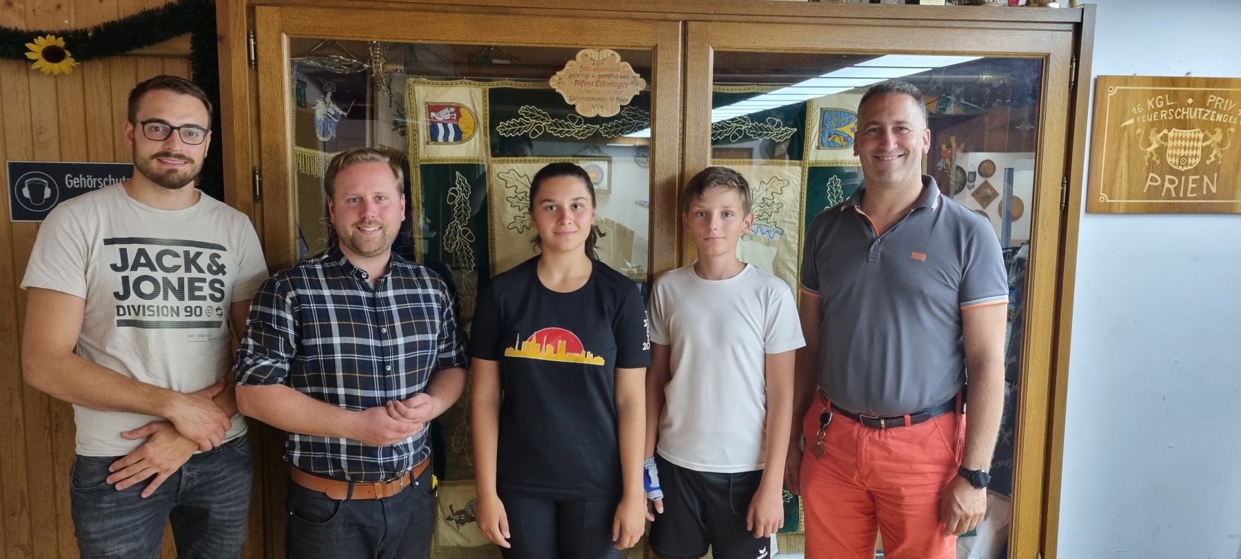 Von links nach rechts: 2.Schützenmeister und 2.Jugensprecher Georg Gmeiner, 1. Jugendleiter Jonas Spensberger, 2. Jugendleiterin Laura Besten, 1.Jugendsprecher Dominik Besten, 1.Schützenmeister Florian Wunderle