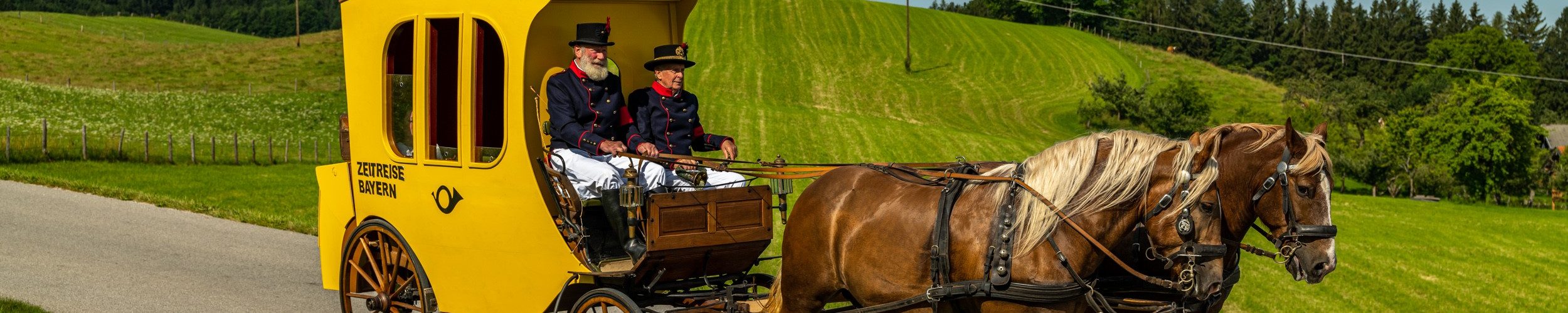 Foto/s: Rainer Nitzsche – Postkutschenbauer Michael Sattlberger (re.) und Postkutscher Michael Stuffer mit der Samerberger Postkutsche für den Kinofilm „Zeitreise Bayern“ unterwegs.