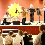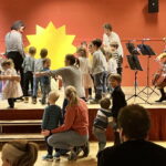 Schließlich löste die weise Schildkröte das Rätsel: Es war eine Sonnenfinsternis. In der plötzlich stillen Dunkelheit intonierte das Ensemble das Lied „Der Mond ist aufgegangen“ und alle durften mitsingen. Als das Licht zurückkehrte, durften die Kinder zum Menuett aus dem Notenbüchlein von Johann Sebastian Bach’s Frau Anna Magdalena Bach um die strahlende Sonne tanzen.