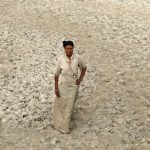 Foto: Ausstellung “ANPASSEN, FLIEHEN, FESTSITZEN”: Badoo Fukura aus Äthiopien steht auf dem Grund eines Wasserbassins. Normalerweise können damit 30 Familien ein halbes Jahr lang mit Wasser versorgt werden. Aufgrund einer anhaltenden Dürreperiode ist der Wasserspeicher schon nach zwei Monaten trockengefallen. Foto: Nancy McNally/CRS