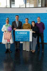Bayerns Gesundheitsministerin Judith Gerlach (Mitte) überreicht Elisabeth Makepeace (Vorsitzende von KlinikClowns Bayern e.V., 2. von rechts) und KlinikClown „Dr. Mathilda Pfiffikus“ die Spende; Copyright: StMGP