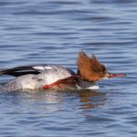 In warmer Winterkleidung, die bei dem seit Wochen vorherrschenden eisigen Ostwind unverzichtbar war, besuchte ich in den letzten Tagen wieder den Beobachtungsturm an der Hirschauer Bucht. Doch wieder war die Bucht wie leergefegt. Keine Blässhühner oder Enten belebten die Wasseroberfläche, ja selbst die sonst allgegenwärtigen Reiher machten sich rar. Nur kurz tauchten Gänsesäger und Schellenten auf und ein Biber zog einsam seine Bahn. Buchfinken, Schwarzmilan und Rohrweihenmännchen sorgten dann doch für Abwechslung.