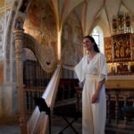 Silke Aichhorn erzählte den Zuhörern, dass es für sie ein großes Privileg ist, an diesem besonderen Ort auf ihrer Harfe zu spielen. Ein kleiner humorvoller Exkurs zu dem Instrument folgte. So ist es nicht so einfach mit einem der größten und schwersten Instrumente den Berg hinauf zu kommen. 40 Kilogramm wollen bewegt werden. Jedes Kilogramm kostet eintausend Euro, kommt aus Amerika und hält nur sechs bis acht Jahre. Die Harfe muss mit Händen und Füßen bedient werden, die Spielerin muss also multitaskingfähig sein, darum sind es meist Frauen, die das Instrument spielen, erzählt die Künstlerin augenzwinkernd.