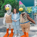 Überraschungs-Empfang: Die beiden Maskottchen der Landesgartenschau, Stetti (l.) und Kirk, begrüßen die Ministerin bei strahlendem Sonnenschein.
