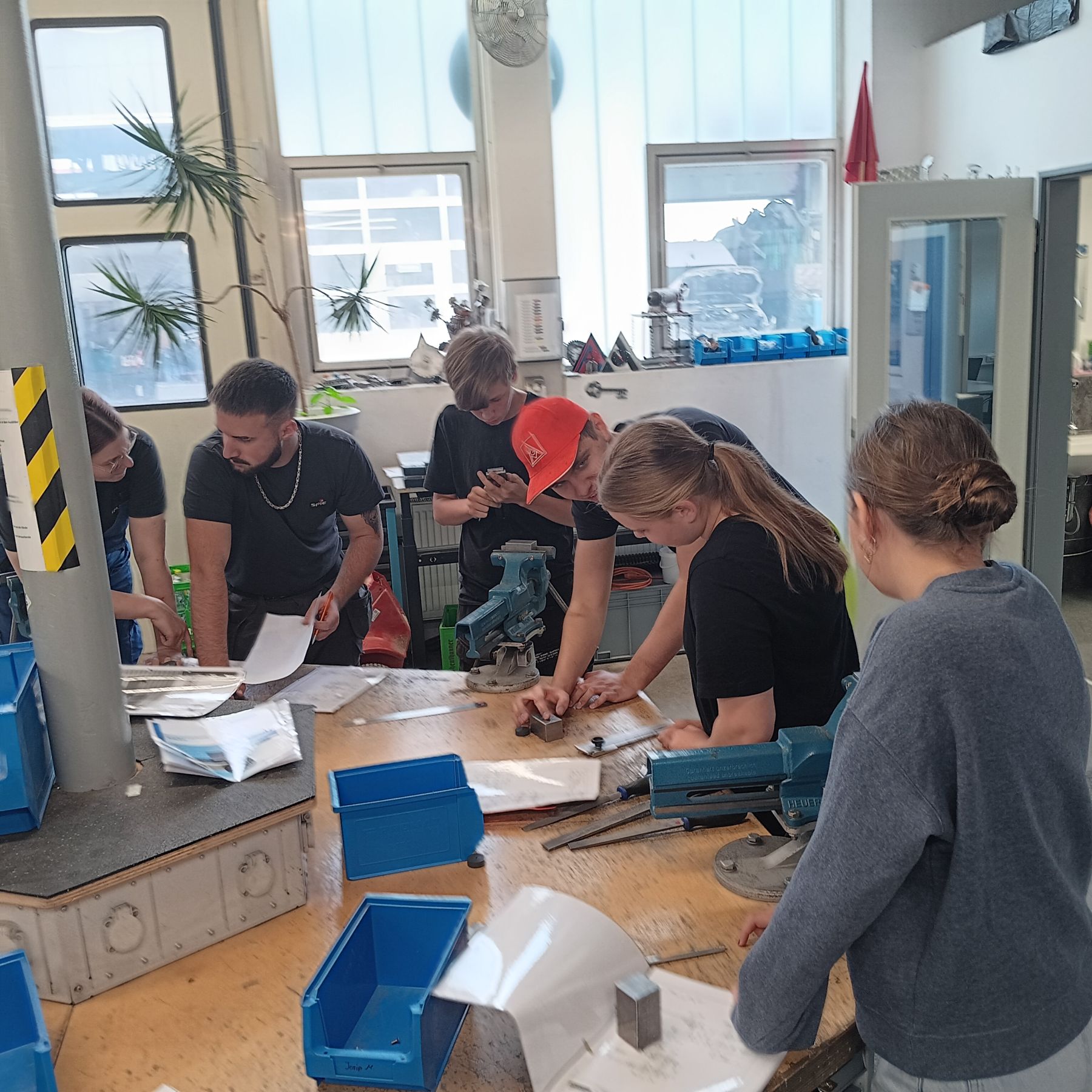 Bei der Jobtour des Landkreises Landshut erhielten die Teilnehme-rinnen und Teilnehmer erste Einblicke in verschiedene Berufsfelder und durften sich – wie hier bei SPIE SE – an eigenen Arbeiten versuchen.