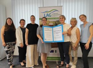 (v.l.n.r.) Tina Schuler (LAG Landkreis Pfaffenhofen), Karoline Bartha (LAG Landkreis Landshut), Anne Mahle (LAG Landkreis Kelheim), Carolin Meinhold (Hopfenland Hallertau Tourismus), Agnes Stiglmaier (LEADER-Koordinatorin) sowie Irene Irchenhauser und Bettina Widmann (LAG Mittlere Isarregion) freuen sich gemeinsam über die LEADER-Förderzusage