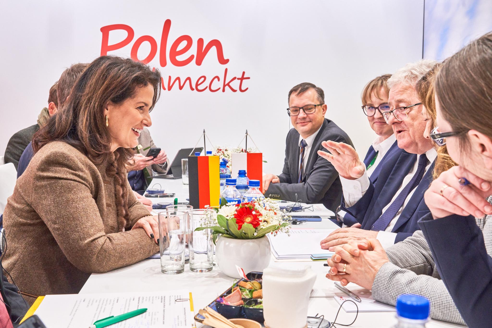 Polnischer Agrarminister Czesław Siekierski (sitzend zweiter von rechts) und die bayerische Landwirtschaftsministerin Michaela Kaniber im Gespräch am Rande der Grünen Woche in Berlin