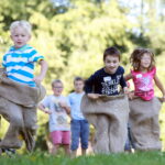 - FLM Amerang_Lausbubentag 1.jpg: Große Sprünge – beim beliebten Sackhüpfen kommt es auf Schnelligkeit und Koordination an. © Bezirk Oberbayern, Archiv FLM Amerang, Gerhard Nixdorf.
