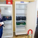 Fotos: Hötzelsperger – Susanne Blöchinger, Leiterin der Chiemseer Tafel vom Caritas-Zentrum Prien und Fritz Seipel, Verbindungsmann zur Gemeinde Prien vor den halb vollen bzw. fast leeren Lebensmittelkisten und Kühlschränken.