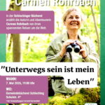 Es kommt die Biologin, Reiseschriftstellerin und Pilgerin Carmen Rohrbach und erzählt von ihren spannenden Reisen und ihrer Lebensgeschichte. Das Thema lautet „Unterwegs sein ist mein Leben“.