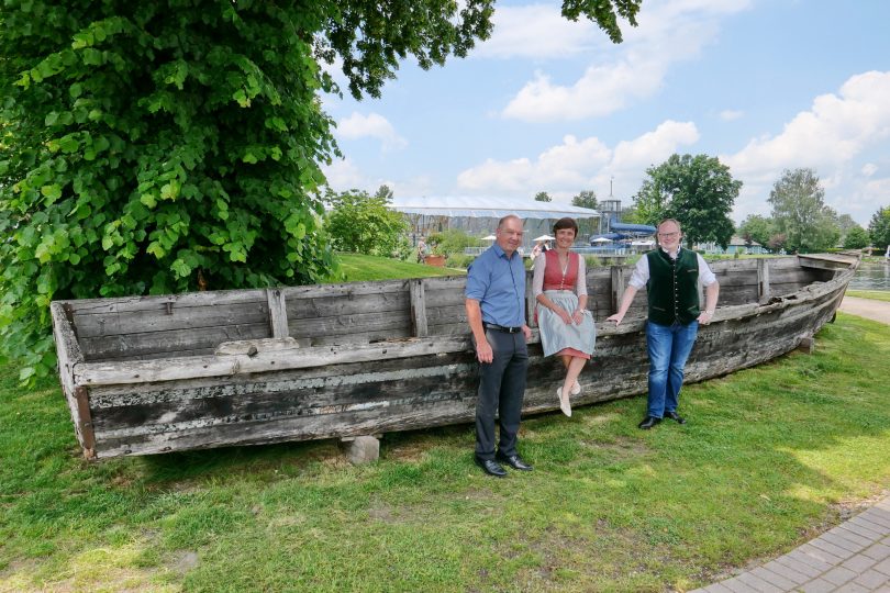 Der „Chiemsee-Renner“ auf den Schären in Prien-Stock findet viel Aufmerksamkeit bei den Einheimischen und Urlaubsgästen. Bei seinem jüngsten Erkundungsgang zusammen mit Geschäftsführerin Andrea Hübner von der Prien Marketing GmbH und mit Geschäftsführer Michael Feßler von der Chiemsee-Schifffahrt machte auch Priens Bürgermeister Andreas Friedrich Halt beim Chiemsee-Renner nahe dem König-Ludwig-II-Denkmal mit direkter Sicht auf das Königsschloss von Herrenchiemsee.