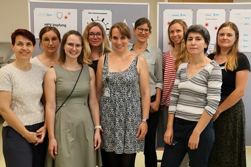 An vier Stationen konnten die Schülerinnen und Schüler der achten Klassen des Karolinen-Gymnasiums Rosenheim am Montagvormittag viele wichtige Informationen zum Thema HPV und HPV-Impfung erfahren. Mit Infoflyern, Bildmaterial, einem Online-Quiz und kurzen Erklärungen gaben Martina Hummel, Regina Ruhland, Manuela Brunner, Susanne Meyer, Judith Blauth, Erika Pühs, Johanna Lassauer, Gayane Poghosyan und Cäcilia Loidl (von links) vom Rosenheimer Gesundheitsamt viele wichtige Hinweise zum Thema. Die Gruppe besteht aus Ärztinnen, Sozialpädagoginnen, Fachkräften der Sozialmedizin sowie einer Kollegin aus der Verwaltung.