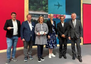 Die Experten der Diskussionsrunde waren sich einig, dass der Modal Shift hin zu mehr Eisenbahn-Güterverkehr nur mit Hilfe einer stärkeren öffentlichen Sensibilisierung gelingen kann. Hierzu will die Initiative „Jeder Meter zählt – Bündnis Gütergleise“ wachrütteln. V.l.n.r.: Matthias Prochazka (Leiter Schienenverkehre, ARS Altmann AG), Georg Lennarz (Fach¬bereichs-leiter Marktfragen Güterverkehr, Verband Deutscher Verkehrsunternehmen VDV e.V), Dr. Petra Seebauer (Geschäftsführerin, LKZ Prien GmbH), Yvonne Bounin (Leiterin Vertrieb und Kommunikation, DB InfraGO AG), Peter Westenberger (Geschäftsführer, DIE GÜTERBAHNEN) und Dr. Martin Neese (Chief Commercial Officer, VTG Gruppe). Bildnachweis: ARS Altmann AG/Mathias Frohnapfel