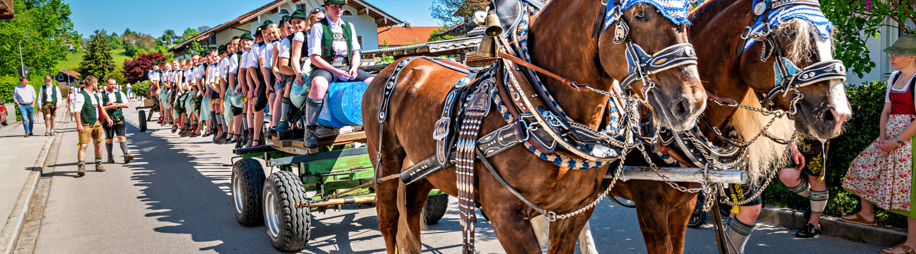 Bereits am Vormittag rollte der 30 Meter lange Maibaum, festlich geschmückt, durch die Straßen – gezogen von einem prächtigen Pferdegespann unter der Führung von Florian Wörndl. Auf dem Maibaum sitzend: die jungen Dirndl und Buben des Trachtenvereins Almarausch Hittenkirchen, in Tracht, mit Stolz und Freude im Gesicht. Der Baum selbst war eine Spende der Familie Weinberger aus Schaurain – ein Geschenk an die Dorfgemeinschaft, das von Anfang an sinnbildlich für den Zusammenhalt stand.