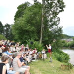Los ging es mit einem Block traditioneller Blasmusik, bei Polka und Marsch machten es sich die Zuhörer mit einem Getränk gemütlich auf den großen und warmen Steinen oder hielten ihre Füße ins kühle Nass der Ache. Doch bald ballten sich die dunklen Wolken und es kam angenehmer Wind auf nach einem heißen Tag. Mit dem Wind wurden auch die Musikstücke beschwingt, mit einem Medley „Golden Swing Time“, einer Popballade der neuesten Generation „Vicky“ und dem rockigen „It’s a beautifull day“, mit „Brassed up Funk“ und einem ABBA-Medley waren die Zuhörer in bester Stimmung und auch die Musiker mit ihrem Dirigenten Konrad Müller hatten offensichtlich Freude an dem Platz. Gewürzt wurde das feine Konzert mit fröhlichen Ansagen von Horst Lehnert. wun
