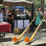 Shareen hat den Village Sunday Market nun nicht zufällig als Treffpunkt ausgewählt. Der Markt bietet nämlich neben Verkaufsständen kleinerer Unternehmer u. a. auch ein Unterhaltungsprogramm, wo sich Künstler und Musiker präsentieren können. So hat sie auch für unser Alphorn-Duo einen Auftritt arrangiert. Es war das letzte Konzert unserer zweiwöchigen Alphorntournee durch Namibia, wo wir unseren Klassiker, den Song „Elefantös“ wieder zum Besten gegeben haben.