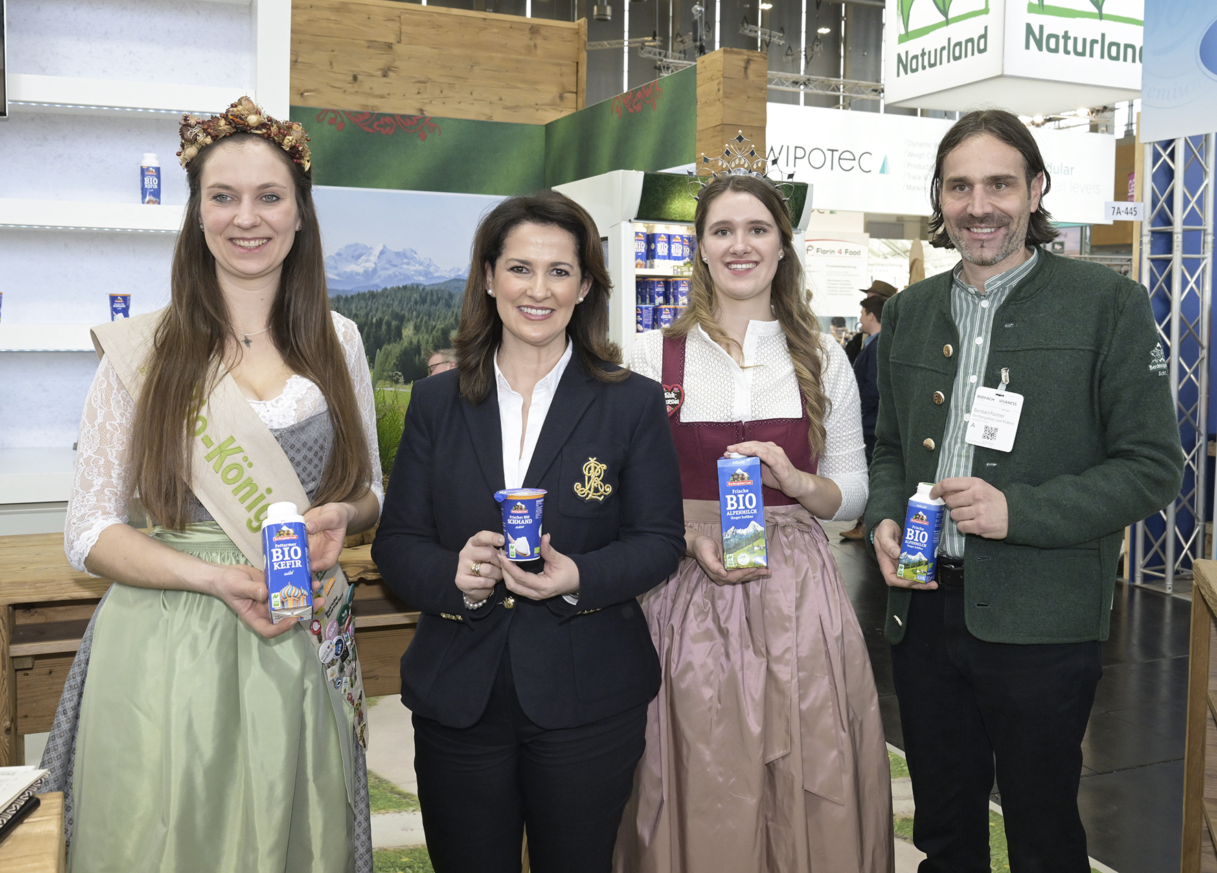 Landwirtschaftsministerin Michaela Kaniber besuchte die Molkerei Ihres Heimatlandkreises auf der Biofach in Nürnberg, begleitet von den Hoheiten Bayerischen Milchprinzessin Philomena Mögele (rechts) und der Biokönigin Raphaela (links). Rechts außen: Bernhard Pointner, Geschäftsführer der Molkereigenossenschaft Berchtesgadener Land. Bildquelle: Christoph Assmann, Naturland