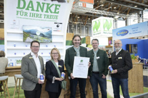 Der Naturland-Verband gratuliert am Biofach-Stand der Molkerei Berchtesgadener Land, die vor 25 Jahren mit der Erfassung und Vermarktung einer zweiten Bio-Milchsorte gestartet war. Von links: Wilhelm Heilmann, Geschäftsführer Naturland Zeichen GmbH, Martina Romanski, Mitglied der Geschäftsführung Naturland, Bernhard Pointner, Geschäftsführer und Florian Zielinkski Bio-Verkaufsleiter der Molkereigenossenschaft Berchtesgadener Land, Michael Stienen, Mitglied der Geschäftsführung Naturland. Bildquelle: Christoph Assmann, Naturland
