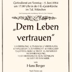 „Dem Leben vertrauen“ führt zu Bitten, zu Hoffnung, zu Dank und manchmal auch zu Trost.Ganz hochaktuell ist dies z. Zt. auch in diesen Tagen voller politischer Aufgewühltheit und dem Wunsch nach Werteorientierung. Ebenso wie seinerzeit, als am 19. Februar 1984, also etwa vor gut 40 Jahren, die gleichnamige Messe nach Texten von Eugen Roth, Georg Thurmair und Prof. Dr. Helmut Zöpfl vom Komponisten Hans Berger mit seinem „Müllner-Peter-Chor“ in der Stadtpfarrkirche St. Peter, die bis auf den letzten Platz gefüllt war, uraufgeführt wurde.
