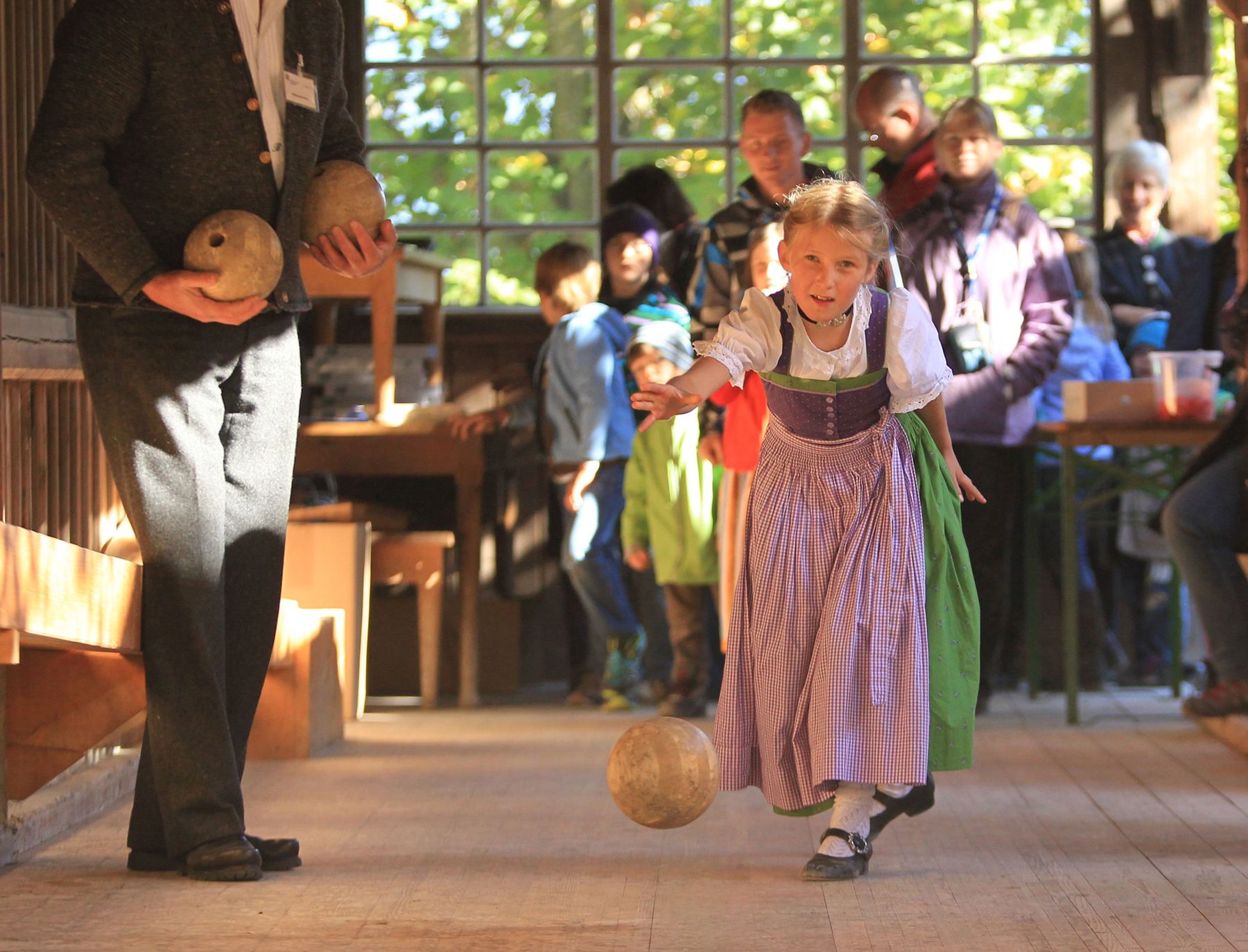 Beim offenen Kegeln können am Sonntag alle Besuchenden eine Kugel schieben. Bildquelle: Bezirk Oberbayern, FLM Glentleiten, Foto: Kolb.