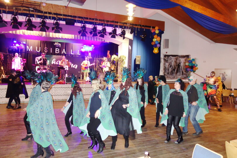 Für beste Stimmung sorgte die hervorragend aufspielende Musikgruppe „5e hamma“. Als tanzende Pfaue waren die „Koasaliners“ aus Kössen erschienen und zeigten so manche ausgewogene Formationen auf der großen Tanzfläche. Begeistert aufgenommen wurde die atemberaubende Mitternachtsshow der „The Hurricanes mit dem Prinzenpaar der Endorfer Faschingsgilde. Stark belagert bis spät in die Nacht war auch immer die beliebte Musikantenbar.