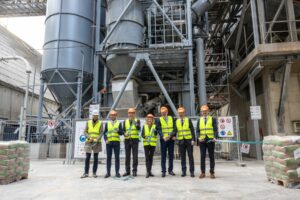 Das Band ist durchschnitten, die Anlage eingeweiht. (Von links) Simon Hausstetter (1. Bürgermeister der Gemeinde Rohrdorf), Daniel Artmann (MdL), Otto Lederer (Landrat Landkreis Rosenheim), Daniela Ludwig (Parlamentarische Staatssekretärin beim Bundesminister des Innern), Mike Edelmann (Geschäftsführer Rohrdorfer), Dr. Christopher Ehrenberg (Technischer Leiter Zementsparte Rohrdorfer) und Markus Judendorfer (Rohrdorfer Net Zero Emission Labs) freuen sich über das erfolgreiche Einweihungsritual.