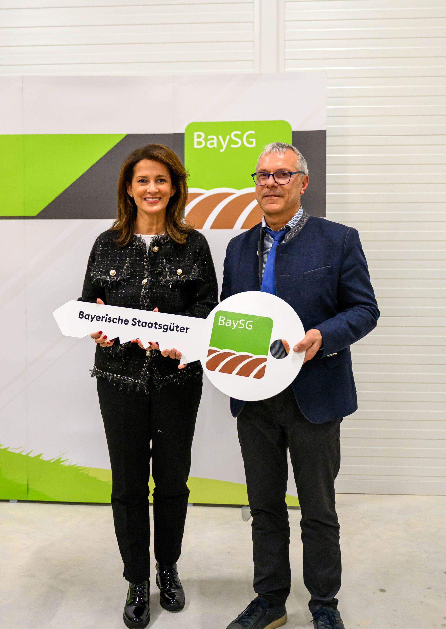 Staatsministerin Michaela Kaniber gemeinsam mit Anton Dippold (GF Bay. Staatsgüter) bei der Einweihung der neuen Tierwohlställe am neuen Forschungs- und Prüfzentrum in Schwarzenau in Unterfranken