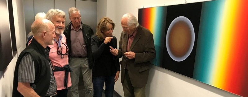 Bildunterschrift: (v.l.n.r.) Die Teilnehmer der Führung am vergangenen Wochenende betrachten gemeinsam mit der Kuratorin Ingrid Fricke und dem Künstler Hans Herbert Hartwieg das Bild „MarsCuriosity Ordensspange“.