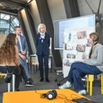 Foto: studienforum1.jpg BU: Bei der Wiedereröffnung des Studienforums im Dokuzentrum kommen Oberbürgermeister Marcus König und Bürgermeisterin Prof. Dr. Julia Lehner mit Schülerinnen und Schülern ins Gespräch. Bildnachweis: Christine Dierenbach/Stadt Nürnberg