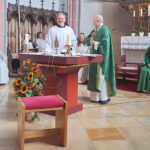 Von den insgesamt ca. 280 Ministranten die mit „ihrem Alois“ an Sonn- und Feiertagen, bei Hochzeiten und Beerdigungen mit im Altarraum standen, haben sich 80 Frauen, Mädchen, Männer und Buben, darunter viele Ehemalige, nochmal eine Albe angezogen um den Festgottesdienst mitzufeiern und wie Pfarrer David Mehlich anfangs des Gottesdienstes erwähnte, habe der Gottesdienst eine besondere Note, weil sich die Pfarrgemeinde vom langjährigen Mesner Alois Hofstetter verabschieden muss. „Er war 36 Jahre Mesner bei uns und habe Generationen geprägt, was man auch an der großen Ministrantenschar sehen kann“, so Pfarrer David Mehlich und hat in einem heiteren Dialog mit Diakon Wolfgang Mösmang den Mesnerdienst mit dem Petrusamt verglichen. So wie Petrus hat der Mesner den Schlüssel der Kirche in der Hand, sperrt die Kirchen morgens auf und abends wieder zu. Ein Mesner ist auch schöpfungsverantwortlich sein, schaut man sich nur die vielen Blumen in der Kirche an, die Zeugen der Auferstehung und nicht Zeugen der Kreuzigung Christi sein.