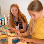Wer Kinder zuhause hat, die sich gern handwerklich beschäftigen, sollte in den Ferien unbedingt an die Glentleiten kommen. Dort können Mädchen und Buben zum Seiler und zur Schreinerin werden, Schablonenmalerei auf einer Postkarte ausprobieren, Wolle verfilzen oder zu Fäden verdrillen, Stoff- und Papierdruck testen und vieles mehr. Auch die Hafnerei Glentleiten, die seit über 30 Jahren an Doris Schickel verpachtet ist, bietet wieder kreative Mitmachmöglichkeiten – vom Geschirr Bemalen, übers Drehen auf der Scheibe und Zeichnen auf Porzellan bis zum Ausprobieren der sogenannten Sgraffito-Technik.