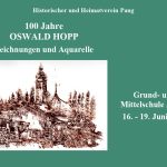 Der Historische und Heimatverein Pang veranstaltet anlässlich des 100. Geburtstages vom Grafiker und Maler Oswald Hopp eine Gedächtnis-Ausstellung in der Aula der Grund- und Mittelschule Aising. Die Eröffnung durch Oberbürgermeister Andreas März ist am Donnerstag (Fronleichnam), den 16. Juni, um 14 Uhr. Die Ausstellung ist vom Donnerstag, den 16. Juni, bis Sonntag, den 19. Juni jeweils von 14.00 bis 18.00 Uhr geöffnet. Der Eintritt ist frei.