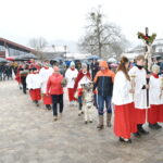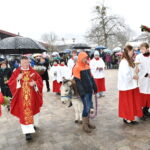 Bild 2214+ 2215 Pfarrer Martin Straßer, die Ministranten und Esel Rambo halten Einzug auf dem Dorfplatz, wo die Gläubigen auf die Segnung der Palmbuschen warten