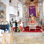 Danach ging es in die Pfarrkirche zum Familiengottesdienst am Palmsonntag. Dort wurde die Leidensgeschichte vom Einzug in Jerusalem bis zur Kreuzigung mit Symbolen von den Ministranten dargestellt. Wunderbar musikalisch begleitet wurde die Messe von den Familien Ritter und Mager. Martin Straßer bedankte sich am Schluss bei allen, die dieses schöne Ritual möglich gemacht haben und fand es ein gutes Erlebnis, um in die kommende Karwoche zu gehen. Nach dem Gottesdienst gaben die Ministranten ihre gebundenen Palmbuschen für eine Spende an die Kirchenbesucher.