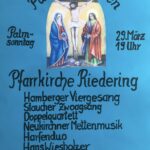 Zur Einstimmung auf die Karwoche singen und musizieren der Hamberger Viergesang, der Staucher Zwoagsang, das Riederinger Doppelquartett, die Neukirchner Mettenmusik, das Harfenduo Hausstätter/ Künstner, Hans Wiesholzer – Akkordeon und die Riederinger Weisenbläser. Texte aus einem Kreuzweg von Pater Tomislav Ivancic verbinden die Lieder und Weisen. Der Eintritt ist frei. Mit dieser Veranstaltung unterstützen wir den Helferkreis Ternopil/ Ukraine e.V. und den Irmengard-Hof der Björn Schulz Stiftung in Gstadt.