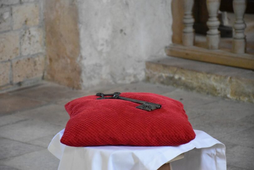 Es ist schon eine lange Tradition, dass am Pfingstmontag der Patrozinium-Gottesdienst in der St. Servatius Kirche in der Gemeinde Schleching gefeiert wird. Pfarrer Peter Bergmaier nahm sich den „Schlüssel“ als Thema vor. Wer den Schlüssel hat, hat Zugang zu etwas, er kann damit auf- zu- und aussperren und er hat Verantwortung für etwas. Der große schmiedeeiserne Schlüssel für die St. Servatius Kirche lag als Symbol auf einem roten Kissen vor dem Altar.